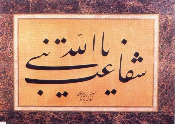 Curator: Welcome. Today we’re looking at “Nokyayhat,” a mixed-media piece showing influences from Islamic art, attributed to Necmeddin Okyay. What's grabbing you first? Editor: It feels like looking into a stormy night sky, those marbled swirls churning beneath a crisp layer of calligraphy. Is that intentional, this chaos held firm by language? Curator: Interesting. Necmeddin Okyay, celebrated for his calligraphy, also excelled in ebru, the art of paper marbling. It's fascinating to consider his integration of abstract patterns and geometric design, especially the use of mixed media, because we don’t really know when exactly this artwork was made. The lack of precise dating gives it this kind of timeless feel, right? Editor: Precisely! Calligraphy's inherently about structure, even devotion to established forms. Against that marbled ground, though, it's not just about faith, but about the persistence of faith across chaotic existence. That marble almost reads like neural pathways—illuminated thought within the mind of the divine, or a mortal, maybe both? Curator: Oh, I love that interpretation. Considering that the artist excelled in traditional arts, what does layering calligraphy over these chaotic patterns suggest? Is he containing the primordial, giving shape to something unfathomable? Editor: Or perhaps it's a nod to the Sufi tradition—the unveiling, taking away the layers to find unity. The calligraphy provides this concrete focus while the marble background suggests that expansive, limitless nature. Each looking for something on the background maybe? Curator: The layering as symbolic…it creates such depth, suggesting worlds within worlds, echoing those fractal patterns common in Islamic art. Thanks. You’ve made me rethink my understanding of it! Editor: Me too! I hadn't connected the medium itself—marble and text—to such rich symbolism until we started digging around in it. Wonderful artwork!