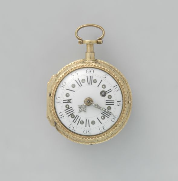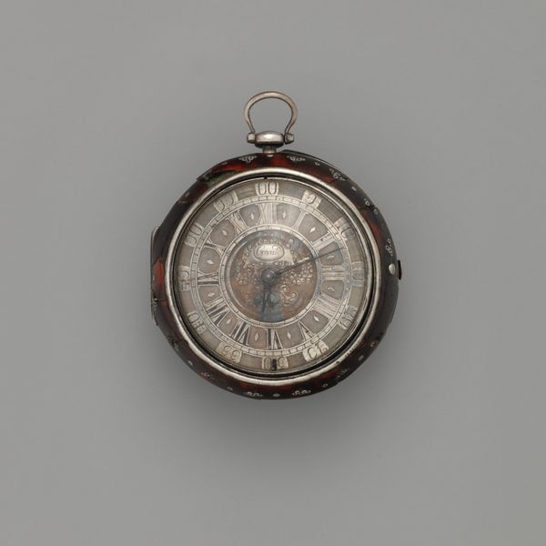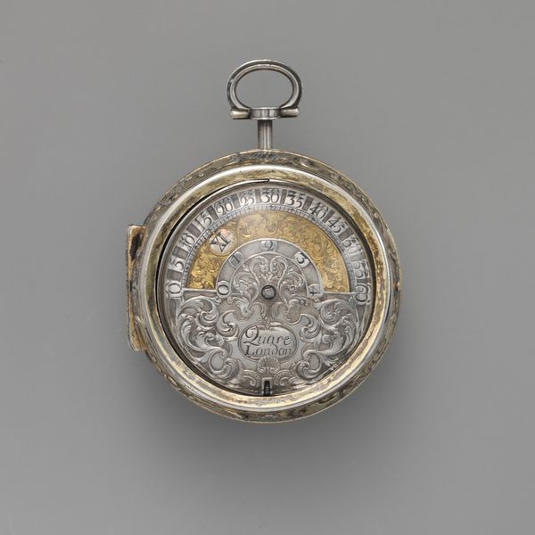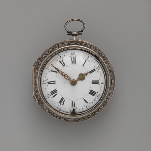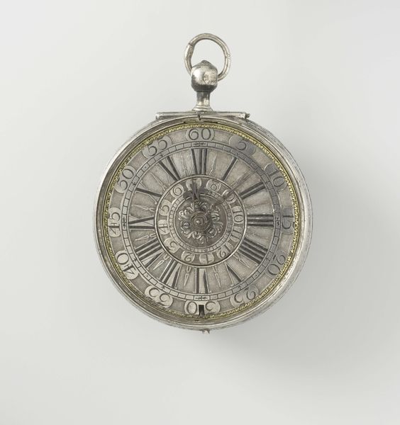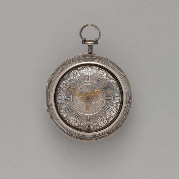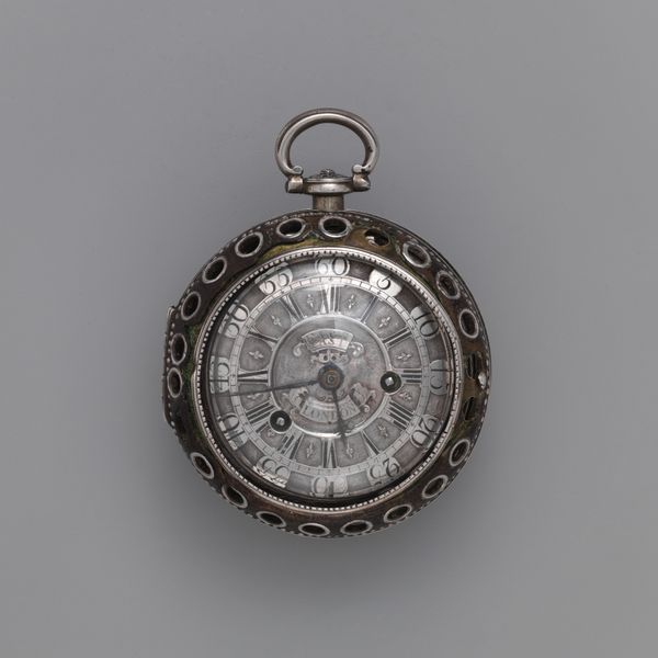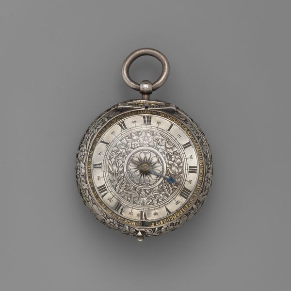 Curator: This exquisitely crafted watch dates back to the early 17th century, somewhere between 1615 and 1635. It resides here at the Metropolitan Museum of Art, a remarkable example of Baroque decorative art. Editor: Right away, it strikes me as something that exists more to be adored than to tell the time. Look at all the delicate carving! What's it made from? Curator: Mostly metal— likely silver. The precision of the carving is remarkable. Remember, timepieces like this were luxury items. Think about who would commission or even be able to afford such an elaborate personal object in the 17th century. Editor: A noble, a countess perhaps? Imagine having that bobbing at your waist all day! I feel the weight of it, and the power… I'm getting an image of someone imperiously checking the time during a very dull political discussion! Curator: Exactly. Its purpose wasn't simply practical. This watch also broadcasts status. In its craftsmanship we can observe cultural ideals, power structures. This kind of decorative flourish shows just how central displaying wealth was in that period. Editor: You can tell too by the style...the dense, almost chaotic detailing of those floral decorations. Not simple, never minimal. More is more! Though I can’t help but think—time escapes us all, doesn’t it? No amount of ornamental excess will hold it back! Curator: Precisely. The watch acts as a potent memento mori as well as a signifier of rank. The passing of time remains, regardless of our position. And ultimately objects like these offer insight into those complicated connections, and the values we project onto the things that we use and cherish. Editor: Beautifully put. All that, ticking away in this tiny package! It certainly offers something more timeless than the hour.