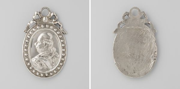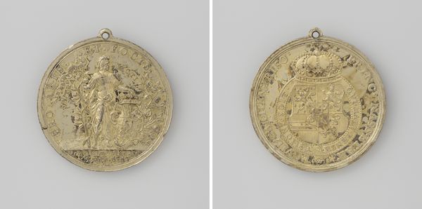 Curator: What strikes me first is its sheer preciousness. Look at the intricate details, the way the light catches the metal...it feels almost intimate, like a secret talisman. Editor: This exquisite metal relief commemorates the elevation of Willem IV, Prince of Orange-Nassau, to Stadtholder in 1747, crafted by Martin Holtzhey. Curator: Stadtholder, you say? It's more than just a pretty trinket then. Was this some kind of PR exercise? Editor: Precisely. Think of it as early propaganda, or better yet, an early modern collectible. The Dutch Republic had experienced a period without a Stadtholder, and Willem IV's appointment was a significant moment. Objects like these were distributed to celebrate and legitimize his power. Curator: A potent little power move disguised as bling! You've got the profile portrait on one side, the crowned heraldic shield of his House on the other, almost a double affirmation of his leadership. Do you notice how both sides give the impression of depth, the figures really come up from the surface. Editor: Exactly, notice the Baroque flourishes too. All to inspire the population to support their leader at this important historic moment. And yet its actual influence would be much reduced as similar objects flooded the markets. What would you have done, if handed this artifact? Curator: I imagine I would polish it daily, the better to reflect power. A beautiful item that reminds us how art, even in miniature, has often played a huge role in society, giving shape and image to historical moments and the exercise of power. Editor: Indeed. It’s fascinating how something so small could carry so much political weight, speaking volumes about the values and priorities of the time.