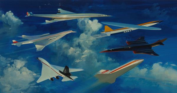 Editor: This is John Berkey's "Five Down in Glory" from 1982, an oil painting depicting fighter jets in what appears to be a dogfight. It's dynamic and unsettling, a swirl of motion and violence against a faded landscape. What strikes you when you look at this piece? Curator: The swirling chaos, certainly, but beyond that, I see a narrative steeped in the archetypes of conflict. Aircraft have, since their inception, served as powerful symbols of national strength, even virility. Berkey presents a kind of dance macabre here, doesn’t he? Editor: A dance of death, yes! There’s almost something romantic, in a terrible way, about how these planes are tumbling. What makes you say they’re archetypes? Curator: Because beyond their mechanical reality, they are stand-ins for larger narratives of power and destruction. The aggressive thrust of the planes, the contrails like violent brushstrokes, all evoke something primal. Do you see any historical precedence here? Editor: Now that you mention it, it reminds me of Romantic paintings, like Delacroix, using intense action and movement to evoke emotion. Only here, it's planes instead of horses. Is Berkey commenting on the spectacle of war, maybe? Curator: Perhaps he is asking us to consider the enduring appeal, and the tragic consequences, of such spectacles. Notice how the landscape is almost indifferent, faded beneath the drama above. Even "glory" comes at a devastating price. Editor: I see that now. I initially focused on the immediate action, but the background suggests a much longer view of conflict and its effect on the environment. Curator: And, the very phrase “Five Down in Glory”. Does this imply individual or collective memory and how it connects to the audience's knowledge? I keep circling back to an engagement of both the conscious and unconscious mind. Editor: That makes so much sense. Thanks, I'll definitely think about it differently now.