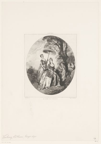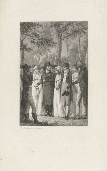 Curator: This engraving is titled "Hertog Albrecht van Beieren ontvangt koning Hendrik IV met zijn dochter Blanka te Dordrecht, 1403," made by Reinier Vinkeles between 1783 and 1795. The medium is engraving. Editor: There's something decidedly stilted about this composition, wouldn't you say? The stark contrast and deliberate linearity give it a rigid formality, almost as if the scene is a stage play frozen mid-performance. Curator: It's depicting a very specific moment of political alliance and exchange. Think about how public image and alliance-building were vital to the stability of political structure in the Netherlands at the time, and how this was conveyed through imagery. The choice to depict a meeting of noble families connects the common viewer with these nationalistic, familial roots. Editor: Absolutely. Note the deliberate arrangement of the figures: the clear power dynamic is depicted spatially. There is a marked emphasis placed on textiles: each costume’s drapery cascades toward the ground plane while simultaneously directing the eye around the whole of the scene. Curator: Vinkeles crafted this during a time of growing national consciousness. Engravings like these would circulate widely, informing and reinforcing the historical narrative. They would evoke the splendor and stability that the Baroque style embodies. Consider the broader context of nation-building that elevates a specific dynastic exchange! Editor: But, in addition to being culturally valuable, I observe a more human element present: each face tells its own miniature narrative while still acting within the broader event, imbuing the figures with purpose, yet their anonymity still keeps me somewhat removed from connecting emotionally. It allows you to decode based on semiotic intention rather than human emotion, drawing clear lines of interaction. Curator: Ultimately, that distance served to create a clear representation of authority that was less about the humanity and more about the idea. This print operates at the juncture of propaganda and fine art. It makes this artwork a fascinating lens for comprehending history. Editor: Precisely. From the deliberate strokes of its lines to the silent figures within its plane, the picture acts more as a constructed narrative than an actual one.