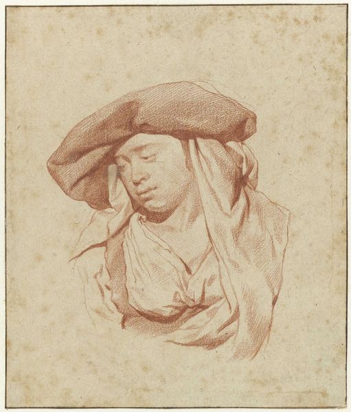 Curator: Immediately, I’m drawn to the warmth of the image. It feels like a study in quiet contemplation. The reddish-brown tones give it an intimate and cozy atmosphere. Editor: Agreed. It has an interesting muted quality to it. Looking at the artwork a bit closer, what we have here is a drawing entitled “Læsende ung mand med et tørklæde svøbt om hovedet,” or "Young Man Reading with a Headscarf," created sometime between 1609 and 1670 by Karel van Mander III. It's held at the SMK, the National Gallery of Denmark. The work seems to be rendered in charcoal on paper, evoking a subdued kind of energy. Curator: The headscarf is intriguing. Its form feels soft, yet the folds create this really nice contrast that suggests a quiet drama, drawing focus to the act of reading and, therefore, the knowledge sought after at the time. The figure's gaze is downcast, emphasizing the inner world of thought and imagination. This symbol may not just indicate a chosen attire; maybe the wrapping and its symbolism refer to the limits, self-imposed or not, within society. Editor: Absolutely. The turban or headscarf immediately positions this figure within a certain historical context—likely a visual signifier of wealth and access to exotic trade or academic pursuit. However, if we unpack its semiotics further within the sociopolitical context of 17th-century Northern Europe, its presence could point to larger narratives about cultural appropriation, exoticism, and even the subtle subjugation of foreign symbols within the dominant Western gaze. In that regard, the headscarf operates as more than a fashionable accessory. Curator: I see your point. It’s impossible to ignore the colonial undercurrents, given the period. However, I also can’t help but return to this idea of “internal escape” or the headscarf symbolizing almost a protection from external gazes. It seems the artist gives a sense of the quiet resistance made possible through literacy. He provides, not just social documentation, but documents a state of mind made possible through the consumption of written works, knowledge and thought. Editor: A quiet resistance through literacy. Yes! That adds yet another vital layer. By allowing space for these nuances to coexist— the external display of appropriated symbols along with an internal sense of “quiet rebellion” — art allows us to consider the multiple facets of any cultural practice. Curator: Indeed. It is in moments like these we're reminded that art, and its reading, becomes its own form of self and social study. Editor: An engaging reminder that art historical perspective is not only relevant but absolutely necessary for interpreting our present realities, as well.