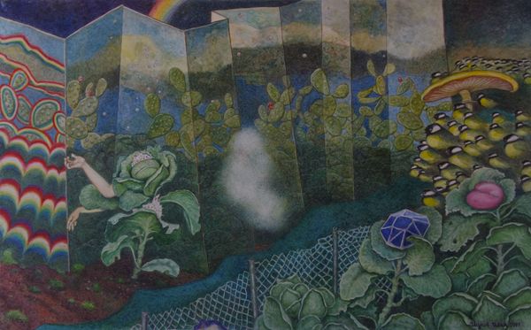Curator: This is Léoonor Fini’s “L’Eau endormie,” a dreamlike landscape rendered in oil. Editor: Immediately, the immersive quality of the color pulls me in; everything seems to breathe with this otherworldly green. The materiality of the paint itself, applied in visible strokes, contributes to the sense of something alive and pulsating. Curator: Note how the lush application of oil paint contributes to the sense of verdant abundance. Fini plays with layering and density here to mimic the chaos of untamed nature, the type she favored throughout her life. Her choice of materials, her method of working them is an active defiance of tradition. Editor: And isn't it fascinating how the form emerges from this chaos? What seems at first glance an abstraction resolves into a kind of reclining figure near the bottom of the canvas, with a sort of statue or apparition of a figure towards the back. To me, that reclining figure calls up Ophelia from Hamlet or even a nymph from classical mythology. The symbols hint at feminine power entwined with nature, maybe with melancholy too, don’t you think? Curator: I find myself looking more closely at what the application and build-up of that material actually represents. We are not talking smooth, flawless depiction here, but thick strokes of oil and the very deliberate manipulation of her chosen media that allows the narrative that you find there to surface in the viewer’s mind. Editor: Perhaps her technical choices reflect a kind of anti-establishment position as a female artist and maybe her exploration of feminine mythology becomes more potent given those technical challenges to tradition. It certainly opens avenues to investigate gender, artistic identity and maybe female authority. Curator: A fitting insight! Considering that she actively flouted convention, refusing the restraints of gender and social mores, and we find similar defiance of those restraints in her visual vocabulary too. Editor: Absolutely, thank you. It's a landscape ripe with symbols, layered meanings, and questions that invite us to interpret not just with our eyes but also with our understanding of Fini herself.