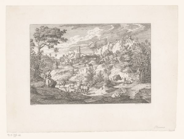 Editor: This is "Landscape with figures and a donkey in a boat on the water" by Jean Louis Demarne, made sometime between 1762 and 1829. It's an engraving and, while small, the composition feels incredibly full and detailed. What sort of stories do you see woven into this piece? Curator: The river here functions not only as a geographical element but as a profound symbol. Water is transition. We see this small boat carrying figures across it, accompanied by a donkey, toward a thatched roof dwelling in the background. Editor: That detail of the boat accompanied by a donkey feels odd to me, what would that imagery mean in this historical context? Curator: Well, think of the cultural memory associated with the donkey: the animal of burden. The figures aren't simply traveling but are laden, perhaps carrying with them histories, traditions, even burdens that shape their understanding of the new space. This crossing isn’t merely a change of location, but potentially of identity. What purpose does that small, ruined wall, near the bank serve in the overall story of cultural passage here? Editor: Perhaps it represents the remnants of the past being left behind, contrasting with the new structure, the house, which stands as a potential future? Curator: Exactly! And the contrast is crucial. The idyllic depiction suggests an almost Eden-like possibility, a renewed cultural landscape rising from the old. Do you feel as though the style adds something of significance to our interpretations? Editor: Definitely, its rough lines help give the impression of figures with rugged lives. Curator: Yes. I find this engraving invites a powerful reflection on the interplay between individual and cultural journeys, remembrance, and re-imagining. Editor: I hadn't considered the ways in which the figures embody more than just physical travelers but also the passage of cultures. Thanks for highlighting the depth within these details!