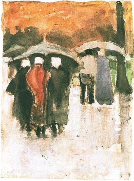 Editor: This is Camille Pissarro’s, "Market at Gisors, Rue Cappeville". It appears to be a print of mixed media – colored pencil and graphite, maybe? The overall impression is one of bustle and a kind of contained chaos. The eye struggles to find a single point to rest on. What stands out to you? Curator: What captures my attention are the parasols. They puncture the visual plane. They're almost like haloes above the heads, yet they speak of protection not from divine judgment, but from the practical realities of weather, daily life. These halos signify mundane lives in this shared public space, emphasizing their collective existence. Editor: That's a fascinating way to look at it. I hadn't considered the parasols in that way at all. The figures seem almost faceless, every individual blurred into one single market experience. Curator: Precisely. This facelessness contributes to a sense of universality. Pissarro uses these impressionistic forms and figures to emphasize not the individual stories but the overarching narrative of community and routine. It prompts the question, what is lost and what is gained when individual identity merges into collective experience? The very human act of buying and selling… does it build society or erase individuality? Editor: So, the symbolism of the parasols contrasts with the blurring of faces to suggest protection but also anonymity? It’s an interesting tension. Curator: Precisely. It is this play of contrasts – individual versus collective, protection versus anonymity – that makes the piece so compelling and representative of the push and pull within a community. Editor: This has made me rethink my initial interpretation entirely. Thank you for pointing out such important elements and symbolism! Curator: And thank you for helping me see anew a familiar image through fresh eyes.