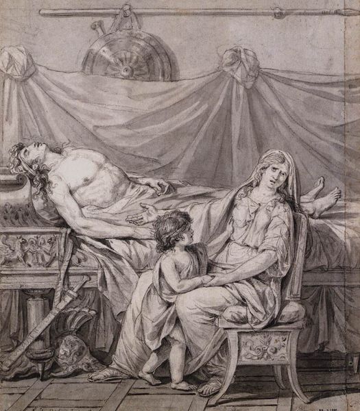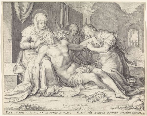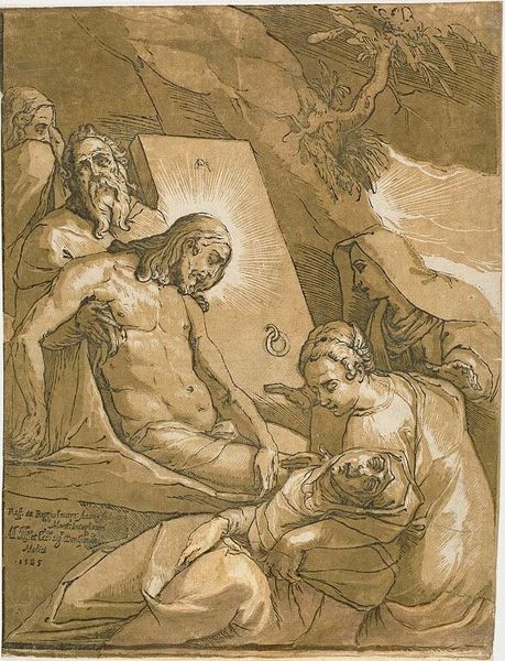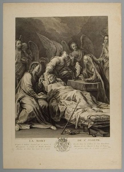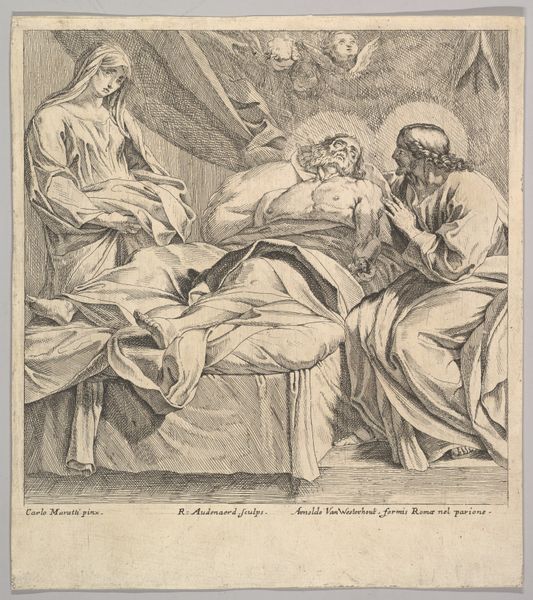 Editor: This is "The Death of Saint Joseph" by Robert van Auden-Aerd. The composition is striking. What symbols stand out to you in this piece? Curator: Notice the halo, a visual cue signifying holiness and divinity, shared by both Jesus and Joseph. Consider how this reflects the evolving cultural understanding of Joseph's role. Editor: That's fascinating! I hadn’t considered the shared halos. Curator: The presence of Mary and the angels indicates a comforting, almost celebratory, passage. Death isn't portrayed as tragic, but as a transition. How does this contrast with other depictions of death you've seen? Editor: I see your point. It challenges the traditional view. Thanks for sharing this. Curator: My pleasure. Exploring these visual motifs gives insight into cultural memory.