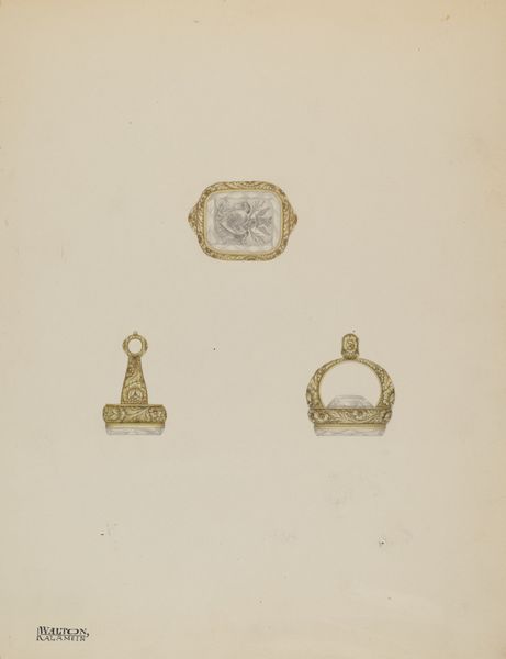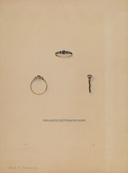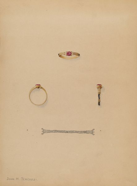 Editor: We're looking at a piece entitled "Brooch" created between 1935 and 1942 by William P. Shearwood, rendered in pencil and watercolor. What strikes me is its almost technical, diagrammatic presentation. What do you see in this work? Curator: I see more than just a visual representation. Consider the date - mid-1930s to early 40s. This object is rendered meticulously, as though preserving a fragment of a world potentially threatened by social or economic turmoil, or even the impending war. This level of precise record keeping reminds me of botanical studies done during imperial expeditions. The seemingly simple choice of rendering what most might call a mere 'bauble' now reads as an attempt at preserving some form of cultural capital. Why choose this particular item, among all things? Editor: So, it's less about the intrinsic value of the brooch itself and more about what it represents as a cultural artifact during that specific time? Curator: Precisely. The choice of medium also speaks volumes. Watercolor and pencil often lend themselves to documentary or scientific illustration. But I am curious, what is your interpretation of the brooch's three different positions in the image? What are we meant to observe through their subtle variance in orientation? Editor: Maybe it speaks to how precious jewelry can be? To view it in multiple ways shows its value to someone... that value then potentially speaks to their societal status during those times of turmoil you mentioned. Curator: Interesting idea. It definitely enriches the interpretation of the piece. Thank you for helping me see this in a new light. Editor: And thank you. I'll certainly consider the socio-political implications of everyday objects much more from now on.