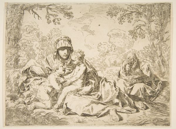 Simone Cantarini created this print, “Holy Family with Saint John the Baptist,” now at the Metropolitan Museum of Art, using etching techniques to render a scene of familial intimacy within a natural setting. The composition strikes you with its delicate balance between the human figures and the surrounding landscape. Cantarini’s use of line—ranging from fine, almost imperceptible strokes to more assertive contours—creates a subtle play of light and shadow, adding depth to the pastoral scene. The figures are softly modeled, and the artist uses hatching to define form and texture, drawing your eye across the tranquil scene. Cantarini’s print destabilizes the weighty, formal qualities of the religious subject matter. The landscape is not merely a backdrop but an active participant in the narrative, blurring the boundaries between the sacred and the everyday. Ultimately, the work reminds us that meaning in art is not fixed. Rather, it comes from a fusion of observation and experience.