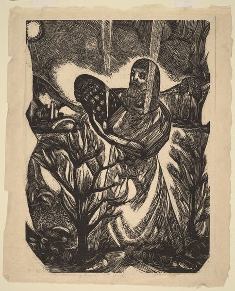 Editor: This is "Merry Xmas From The Zorachs," a woodcut print created by Marguerite Zorach in 1921. It has an interesting bold and graphic feel. I am immediately drawn to the stylized mother and child embraced at the center. What do you see in this piece that informs its symbolism and emotional impact? Curator: The composition is quite striking, isn’t it? Look at how Zorach uses the black and white contrast to define not just forms but also to suggest emotional states. Notice how the negative space dances around the figures and the backdrop of foliage that also look like sun rays, but with a primitive hand-crafted aesthetic. What feelings are conjured for you with this simplified language? Editor: It feels warm and intimate, while also slightly unsettling. The lack of detail makes it almost dreamlike. Also, why the emphasis on the mother's physicality; what’s the purpose? Curator: Her choice to portray motherhood with such frankness pulls from a deep well of archetypes, where woman embodies fertility, nurturance, and earthly power. Her direct gaze implies courage, inner strength. Remember the woodcut style here allows to evoke a strong and bold symbol, rather than be a depiction of reality. Don’t you think this expression becomes a new type of universal representation? Editor: I see what you mean. It’s less about capturing a specific person and more about representing the universal idea of mother and child, especially through such symbolic lines. It seems this Christmas message extends beyond the personal. Curator: Precisely. It taps into an eternal narrative and uses bold design to offer something primal, yet deeply resonant, in this Yuletide message, full of hopes for continuity and shared roots. Editor: Thinking about those themes, that really changes my perception of the piece. I can see how Zorach uses simplicity to invite contemplation. Thank you.