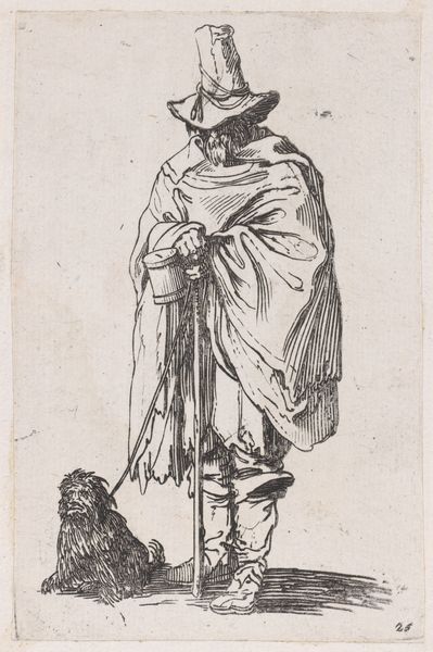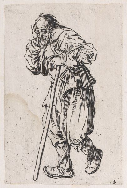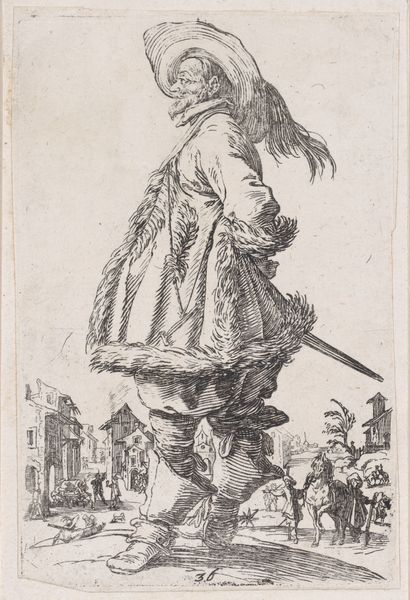 This engraving at the Met, a copy of "The Officer with a Large Feather in His Hat," uses stark lines to depict an overdressed military figure. The composition is dominated by the officer's towering presence, rendered with an almost comical emphasis on his elaborate costume. The artist employs hatching and cross-hatching to create volume and texture, particularly noticeable in the plume and ruffled collar. This technique also accentuates the character's exaggerated features, lending him an air of theatricality rather than authority. The background battle scene is miniaturized, almost as if to mock the grandeur of military exploits. The print destabilizes traditional heroic imagery by reducing the officer to a figure of spectacle. It engages with semiotic systems of status and power, questioning the values associated with nobility through satire. The focus on surface detail, rather than substantial form, serves to undermine the presumed virtues of its subject, reflecting a broader cultural skepticism towards the aristocracy.