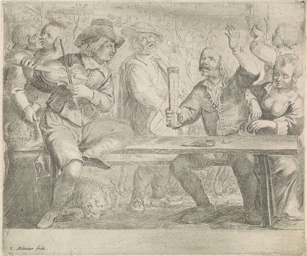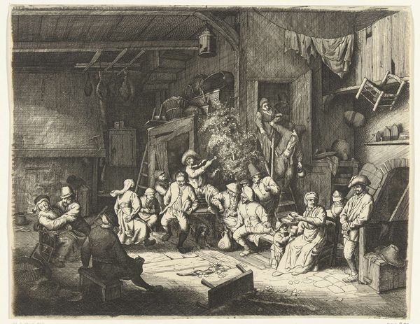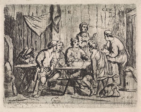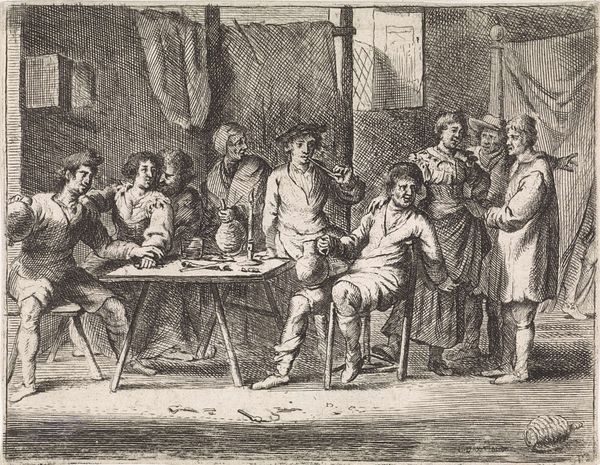 Cornelis de Wael captured this scene of camaraderie in an etching, presenting a gathering within a tavern. The central motif here is the shared drink, a communal vessel being raised in merriment which binds these figures together. Such a vessel echoes through time, resurfacing in ancient Greek symposiums where wine was shared as a symbol of unity and intellectual exchange. It also appears in Christian iconography, the chalice in the Last Supper representing sacrifice and communion. This simple act of sharing transforms the mundane into something deeply symbolic, connecting these figures to a timeless ritual of human interaction. The image is charged with a bacchanalian spirit, an intoxication not just of the body but of the soul, engaging the viewer on a subconscious level, stirring within us the primordial urge to connect, celebrate, and share in the fleeting joy of existence. This is a sentiment which ebbs and flows through history, resurfacing in various forms.