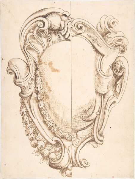 Curator: Let's discuss this "Design for a Trophy with Sword and a Plumed Helmet Decorated with Grotesques Masks, Classical Motifs.," a captivating work created anonymously sometime between 1600 and 1700. It is currently housed at the Metropolitan Museum of Art, offering a fascinating glimpse into the Baroque era's decorative arts. What are your initial thoughts? Editor: Gosh, what a trip! My immediate sense is, well, cluttered. There's so much vying for attention here! A plume helmet overflowing with flourishes and grotesque faces, plus sword motifs, almost shouting a story of...of chaotic power? Curator: Yes! That sense of dynamic visual overload is quintessential Baroque. The helmet, a powerful symbol itself, is further embellished. This isn't just armor; it’s a canvas for cultural memory. We see these grotesque masks - often reflections of primordial fears - deliberately integrated alongside the classical motifs - which embody a longing for a lost era of balance, order and wisdom. The trophy form traditionally signifies victory, and this work reminds us to pause and contemplate what that meant through the long lens of time. Editor: Okay, "cultural memory"—I love that! But look closer: there is an attempt to elevate all this brutality into something grand and refined through the intricate details made by the artist with etching and ink. Yet, that sword kind of punctures the whole pretense, doesn’t it? It feels very knowing, a wink to the viewer? Like it understands the dark underbelly beneath the showy exterior. Curator: Precisely. That contrast between idealized forms and more primitive imagery serves as a powerful allegory of Baroque culture as it negotiates new values and aesthetics emerging across a convulsing continent during those one hundred years. What cultural narratives can flourish from violence? Can it create a thing of beauty, a powerful symbol of prestige and skill and authority, while we come to reckon with how that violent history impacted so many of our modern societies? Editor: Hmmm, very interesting... Now, considering this wasn’t mass produced but actually a design, the craftsmanship jumps out even more. To consider someone painstakingly crafting such layered, evocative imagery is wild. It feels like a blueprint, a glimpse into their intricate inner landscape. Curator: Exactly, the meticulous detail, even in a design, reveals how intertwined violence and beauty were in the artistic imagination of the period. This piece encapsulates a very fraught, complicated negotiation of power and legacy. Thank you for your wonderfully insightful perspectives. Editor: Well, thank YOU for decoding all that fascinating stuff! Always great to have an excuse to wander inside my inner landscapes.