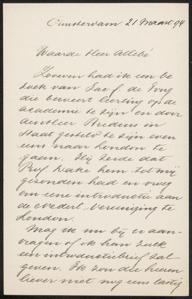 This is a letter to August Allebé, penned by Chris Huidekooper, a dance and art critic. It's a handwritten document, and you can see the artist is thinking through making as he goes, with the dark ink creating flowing lines which build up a dense, but ordered, script. The texture of the paper seems smooth, and the ink sits on the surface, slightly raised, giving the writing a tactile quality. Zoom in, and you can see the variations in pressure, the way the pen hesitates and then surges forward, creating moments of darkness and light within each stroke. Notice the way certain letters are formed, the elegant loops and curves, and how they contrast with the more angular shapes. It reminds me a little of Cy Twombly's scribbled paintings, where the act of writing becomes a kind of performance, a dance between the hand and the page. It points to the idea of artmaking as a process, an ongoing conversation. Even in a seemingly simple letter, there's a world of artistic intention and expression.