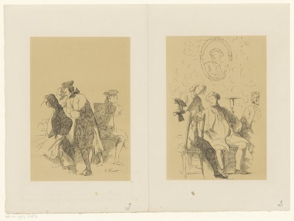 Victor Adam created this print, “Twee voorstellingen met infanteristen van de Keizerlijke Garde en koning Clovis te paard,” sometime in the first half of the 19th century. The lithograph presents two scenes: on the left, uniformed infantrymen, and on the right, King Clovis on horseback. Considering the period of its creation, this work is shaped by the rise of nationalism and romanticism in Europe. The detailed depiction of military figures romanticizes the idea of national identity, yet omits the brutal realities of war. Victor Adam actively participated in this movement. It is worth noting that the positioning of King Clovis, appealing to a higher power during battle, introduces a divine element. This glorification of historical and military figures often served to unite a population under a shared, yet idealized, past. How do we reconcile this romantic vision of war and national identity with the realities of conflict and its impact on diverse populations?