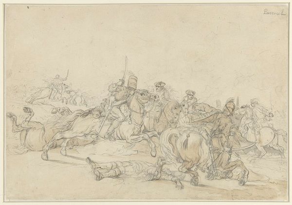 Curator: Today, we’re looking at a drawing by Cornelis de Wael entitled, "Overval op boeren" which roughly translates to “Attack on Farmers." Executed sometime between 1602 and 1667, this ink on paper work offers a dramatic glimpse into rural life. Editor: My first thought? Chaotic. The composition feels incredibly dynamic. There's violence depicted, obviously, but there's also a real sense of energy, almost a frenzy. It’s unsettling how casual some of the figures seem amidst such brutality. Curator: De Wael’s skill lies in depicting these complex scenes with a deceptive ease. Drawings like this offer insights into the social tensions of the time, a period marked by upheaval and conflict across Europe. Editor: Exactly. And consider who's being victimized here—the farmers. This evokes class conflict and the vulnerability of those who worked the land. It forces us to confront how power operates, who holds it, and who suffers at its hands. Curator: We should acknowledge how these depictions also played into contemporary power structures and biases. Genre scenes of peasant life were popular, but frequently perpetuated stereotypes or reinforced social hierarchies. This drawing offers a complex narrative, but how might its original viewers have interpreted such violence? Editor: That’s key, isn’t it? This piece prompts questions. Did the artist intend to critique this brutality, or merely document it? And regardless, how does the act of representation itself contribute to or challenge existing inequalities? Whose voices are truly absent here, besides those silenced literally in the work? Curator: Precisely, and this work acts as a window, allowing us to examine and question the narratives that continue to shape our understanding of power, conflict, and history today. Editor: Thinking about art this way is never passive, it means grappling with messy realities, and remembering art can also participate in social injustice even as it attempts to explore its ramifications. It pushes us to question easy conclusions and confront ongoing systemic inequities.