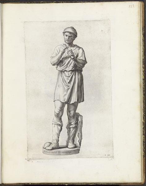 Curator: The etching before us, crafted by Giovanni Luigi Valesio between 1636 and 1647, presents what is believed to be a statue of a seated man, potentially Diogenes himself. Editor: He looks so weary. Even in this delicate line work, you can sense the weight of his contemplation. The rendering of the drapery is exquisite. Curator: Absolutely. Consider Diogenes, the Cynic philosopher, who challenged societal norms and championed a life of virtue and simplicity. How does Valesio’s interpretation engage with the established iconography of this figure? We have to ask about what virtue and simplicity meant in the 17th century. Editor: His sandals, the simple robe... it all suggests a detachment from worldly possessions, doesn't it? Yet the muscularity hinted at—it's a visual echo of the heroic male nude in classical art. It's not mere deprivation. And that little object he holds; do we know what that could be? Curator: Possibly his iconic lamp, used in broad daylight to "seek an honest man". It reflects a disillusionment with societal values and the pursuit of authenticity, or the very male version of it. Editor: And the pose, the head resting heavily on his hand, it's become such an established symbol of melancholy and deep thought throughout Western art. But the statue is raised upon a kind of book-like plinth... why raise philosophy up in that way? Curator: Valesio is situating Diogenes within a complex framework of cultural memory, highlighting the enduring relevance of his philosophical inquiries. What does it mean that only powerful elites could engage with this sort of history-painting portrait? I would ask: how are different modes of gender and class at work here? Editor: The subtle tonal variations achieved through etching allow for such a nuanced portrayal. This image resonates deeply. He speaks volumes about intellectual inquiry, about being skeptical towards the systems we find ourselves within. Curator: A reminder that critical questioning and striving for justice have always been integral parts of the human narrative, a point no less potent now. Editor: Indeed, his critical lens echoes powerfully today, reminding us to question, to analyze, and to resist blind acceptance.