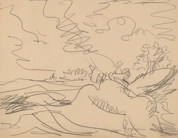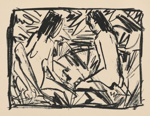 Curator: The gestural quality of this work immediately grabs your attention. It's Ernst Ludwig Kirchner’s "Two Bathers at Fehmarnküste," dating back to 1912. Executed in ink on paper. What are your first thoughts? Editor: Stark and almost aggressively unfinished. The linework practically vibrates. Is it supposed to evoke a sense of freedom or perhaps anxiety, rendered with such immediacy and apparent rawness? Curator: Kirchner was a central figure in Die Brücke, an important Expressionist group. Looking at this drawing in relation to their overall project—the liberation of art and the embrace of direct experience—illuminates his process. The visible immediacy of the pen strokes speaks volumes. He really seems to be capturing a raw, visceral moment. What's fascinating here is how this piece blurs the boundaries between a preliminary sketch and a finished work. Editor: True, the speed is evident, like catching a fleeting moment. But, thinking about the institutional aspect, how did Expressionists navigate the art world? Did galleries readily accept such apparently unfinished work? Were there critics who appreciated it? Curator: Acceptance was definitely a battle. Expressionism challenged traditional academic standards of finish and subject matter. Figures like Kirchner actively sought alternative exhibition spaces to showcase their work. Think of spaces beyond established museums and academies, emphasizing the direct engagement with the public. Also, consider that Kirchner, through Die Brücke, wanted to merge life and art; these works allowed them to get there directly and without artifice. Editor: So, this rawness, in a sense, became a declaration of artistic autonomy. Almost a refusal to conform to bourgeois taste and the academic art system. The materiality of ink, swiftly applied on paper, as an act of defiance itself. I wonder, does this piece invite us to reconsider notions of 'high' and 'low' art? To question value judgments associated with different methods and media? Curator: Precisely. The visible process democratizes the art object. He elevates the sketch to a primary mode of expression. The materials –simple ink and paper, suggest accessibility challenging art as rarefied object. Kirchner shows us what labor and emotion went into its creation. Editor: Kirchner challenges traditional hierarchies while leaving us to wonder about the role of institutions, their limitations and even, sometimes, their complicity in what's considered "art." I am intrigued to explore these artists more deeply. Curator: Yes, the drawing serves as a potent reminder to question established narratives. It also provokes reevaluation of what constitutes "art" in a rapidly changing social context.
