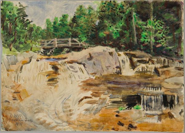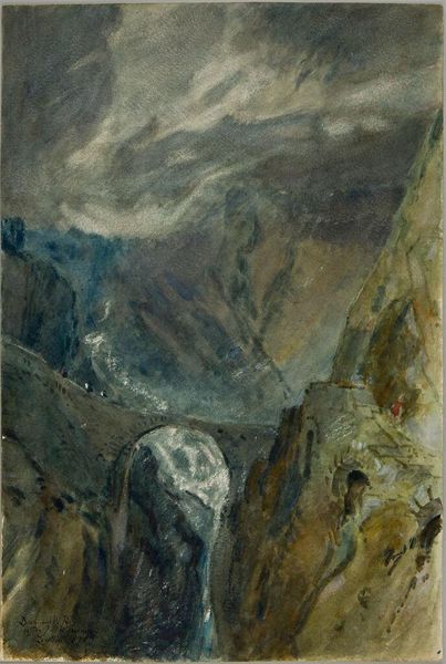 Editor: Here's "Landscape, after Turner" by Robert David Gauley. It's a watercolor that feels both turbulent and ethereal to me. Given it's 'after Turner', I'm curious, what kind of symbolism do you see being carried forward or reinterpreted here? Curator: The echoing of Turner brings forward his interest in the sublime, yes. Gauley seems to be delving into the emotional weight of nature, using light and shadow to evoke a sense of awe, and perhaps even a touch of melancholy. What feelings does the scene elicit in you? Editor: It definitely has that feeling of being overwhelmed by nature. I hadn't considered the melancholy, but I see it now in the muted tones. Curator: Turner aimed to capture the spiritual power within nature. Gauley, by referencing him, engages in a dialogue with that tradition. It's fascinating how artists use these visual symbols across time, isn't it? Editor: It is. It makes you wonder what future artists will make of our symbols. Thanks!