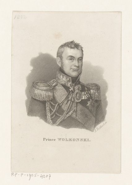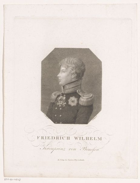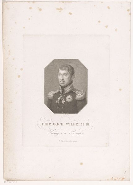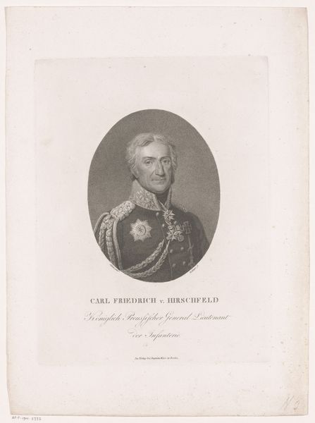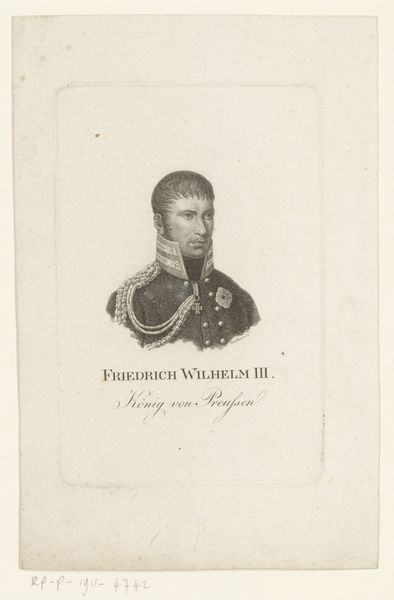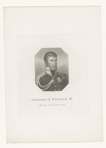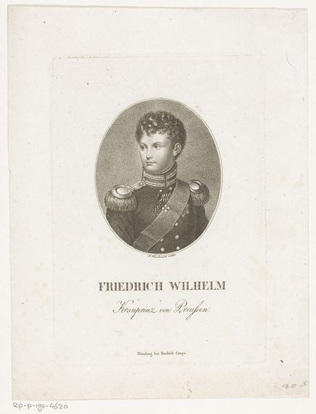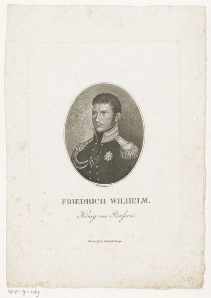 Editor: Here we have Johann Georg Mansfeld’s "Portret van Frederik Willem III van Pruisen," dating from 1774 to 1817. It's an engraving, so the starkness of the lines really jumps out at me. There's something quite austere and controlled about the whole composition. How do you interpret this work? Curator: Well, if we observe the linear precision and the deliberate gradations of tone achieved through engraving, we immediately apprehend the artist’s mastery. Note the symmetry of the oval frame and the carefully balanced elements of the portrait itself. This is more than just a likeness. Editor: Yes, it's very balanced, the composition and also how details are shown. Is that something the artist wants to emphasize? Curator: Indeed. Consider how the artist utilizes line to define form and texture. The subject's face, with its sharp angles and meticulous detail, contrasts subtly with the softer, more diffused treatment of the uniform. Does that contrast suggest anything to you? Editor: Maybe a focus on reason, presented as opposed to softness, or chaos, so the rigidness shown here? It seems pretty Neoclassical. Curator: Precisely. We observe a conscious attempt to impose order and clarity upon the subject. How does this align with the subject's societal role? Editor: Considering that it's King Frederick, he must impose control and order. Curator: Precisely! The artistry of this engraving doesn't just replicate appearance, it articulates power. A key element of formalist interpretation. Editor: I never thought about that, I was only focused on shapes and balance and contrast, but I can understand how they relate now.
