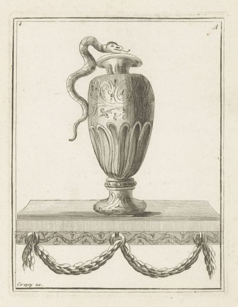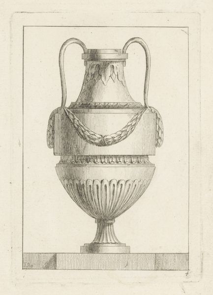 Here we see "Urn met lange hals en deksel", created by Françoise Bouzonnet, an engraving which captures a classical urn with a pronounced neck and lid. The composition, dominated by the urn's symmetrical form, evokes a sense of balance and order. Bouzonnet's meticulous use of line and hatching articulate its complex textures and decorative details, from the acanthus leaves near the top to the geometric meander pattern around the body. Structurally, the urn embodies a semiotic system of signs. The classical motifs, rendered with precision, allude to a rich cultural history. The vase is more than just an aesthetic object; it's a vessel of meaning, engaging with notions of antiquity. The refined details and textures challenge fixed meanings. Bouzonnet invites us to consider the vase not only as an aesthetic form but as a point of convergence for art, culture, and history.