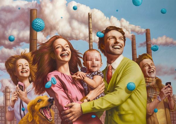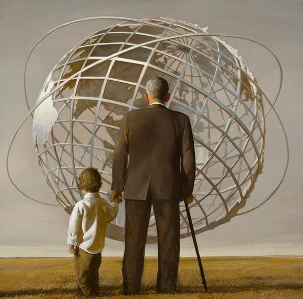 Editor: We're looking at "America" by Bo Bartlett, created in 2007. It's an acrylic painting, and what strikes me immediately is this almost unsettlingly still scene of family life. There’s a kind of quiet tension. What do you see in this piece? Curator: The painting certainly evokes a mood, doesn't it? But beyond the immediate atmosphere, I’m drawn to the title, “America”, and how Bartlett might be commenting on contemporary society through this family portrait. Notice the geometric forms on the horizon—could they symbolize a particular socio-economic landscape? How might that landscape be informing the expressions and interactions of the figures depicted? Editor: That’s fascinating, I hadn't considered the shapes on the horizon so closely. They feel like starkly uniform housing. So are you suggesting Bartlett is using the setting to say something about American ideals and maybe their limitations? Curator: Precisely. Think about the traditional imagery of the nuclear family, often celebrated, yet here we see something slightly strained. The father’s almost rigid pose, the mother seemingly turned away. Consider also, the power dynamics reflected in who is looking where, who has a voice, and whose actions control movement. Who gets the highest swing? The painting seems to be examining the tensions inherent in the American Dream, particularly regarding belonging and the gaze. How might museums further encourage public discourse on these representations of American family and society? Editor: This has really shifted my understanding. I was focused on the emotional quiet, but now I see how the artist is actively engaging in a dialogue about larger societal issues and the gaze through this single scene. Curator: Exactly! The personal is political, as they say. And art is one of the ways to look into socio-political tensions. It really shows the value of thinking about the historical context when looking at art. Editor: I agree. It encourages us to look beyond the surface.