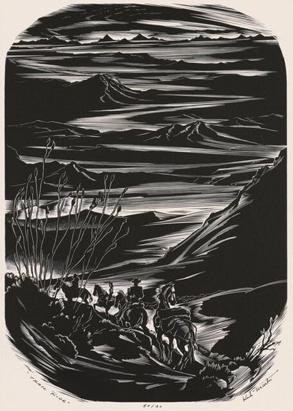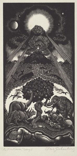 Editor: This is "The Peaceable Kingdom," a 1955 wood engraving by Fritz Eichenberg. It's striking how the artist contrasts such detailed, almost chaotic textures with a calm scene of animals coexisting. What draws your eye in terms of composition? Curator: The dynamism lies in the interplay of contrasting forms and textures. Observe the tree in the center – its gnarled branches create a dense web against the smooth backdrop, and the light source that almost radiates lines towards the viewer's eye. It sets up the work's tension between detail and serenity. How does that affect your reading of the figures? Editor: It makes the central grouping of the child and the animals feel more staged or intentional. I wonder what that figure of a child means here. Curator: Let's consider its form. Notice the solidity of the figures—each rendered with a precise line that articulates mass and volume. The textures evoke different surfaces—the fur of the bear, the sleekness of the leopard, the child’s smoothness, while the gaze, from most, centers towards that one single point. That directs our sight towards the baby. Editor: It almost gives that figure a divine, hopeful light to the print. It seems so naive but also well planned, technically, with all its linear variations, light balance and focalization, even its vertical nature... Curator: Indeed. Eichenberg manages to orchestrate a formal arrangement that compels us to consider its subject. In conclusion, Eichenberg's formal command elevates what might be a sentimental scene to one imbued with structured grace, I wonder about what one may call sacred and the act of observing in the contemporary times. Editor: Thanks. I never noticed those textural and focal contrasts at first! Now I feel like I am appreciating more the symbolic arrangement, and can start asking some other questions about who's viewing at this composition today.