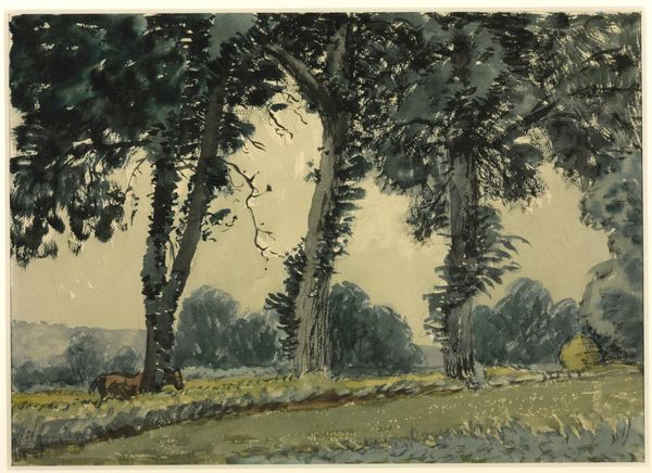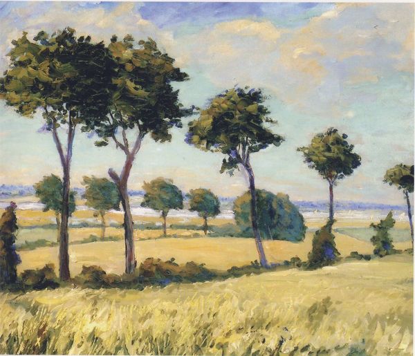 Editor: This is Ferdinand Hodler’s "Landscape at the Jonction at Geneva" from 1878, painted en plein-air with oil paints. I find it so serene. There's something really inviting about the composition. What draws you in? Curator: Ah, Hodler. He could find the extraordinary in the ordinary, couldn’t he? For me, it’s the almost palpable stillness. You can practically feel the summer heat radiating off that path. Notice how the composition almost funnels your gaze? That road gently guides you into the heart of the painting. Doesn't it make you want to stroll along there, maybe with a dog or a very chatty friend? Editor: It does. It almost feels like a stage set, with those trees acting as curtains on either side. Were landscapes a departure for Hodler at this point? Curator: In a way, yes! This piece is an early work. Later, he'd become much more preoccupied with symmetry and, some might say, even a touch of monumentalism. Think of this landscape as a younger, perhaps less certain Hodler, just playing with the light and shadow of a Geneva summer. Does seeing it like that change your impression? Editor: Absolutely! Knowing it's an early work gives it such a sense of…possibility. The painting is like Hodler finding his own road, so to speak. Curator: Exactly! And sometimes, those early explorations are the most honest, the most revealing. We all start somewhere. And what a pleasant somewhere this is, eh?