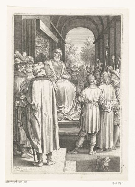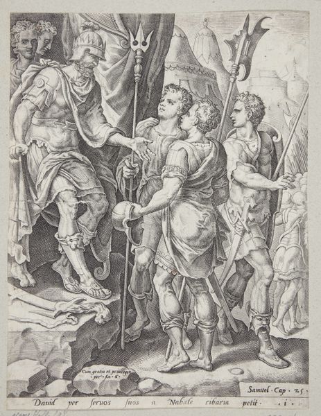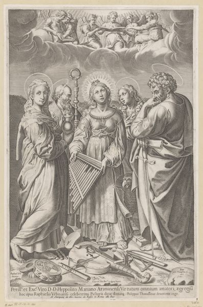 Editor: So, this is Giulio Bonasone’s 1531 engraving, "Saint Cecilia standing in the centre accompanied by Saint Paul, the Magdalene, Saint John the Evangelist, and Saint Augustine," currently at the Met. The contrast between the earthly figures and the ethereal angels above creates an interesting visual tension, doesn't it? What strikes you most about its imagery? Curator: Indeed. Look closely at Cecilia's instrument – not merely an organ, but almost a rack of pipes, suggesting a cacophony about to be unleashed. The broken instruments at her feet imply the rejection of earthly music, in favour of divine harmony. Consider, too, the watchful presence of Saint Paul, sword in hand. What power does the sword possess as a cultural symbol, and how does it contrast with Saint Cecilia’s passive disposition, don't you think? Editor: The sword represents power and conviction, versus Cecilia's quieter, musical devotion. I hadn't thought about that tension. It’s fascinating how they're juxtaposed. Curator: Exactly! And notice Augustine holding the chalice, symbolizing grace and transubstantiation – he gazes not at Cecilia, but upwards, acknowledging the source of true music. Each figure bears the weight of specific cultural and psychological meanings. It serves not only religious doctrine but reveals the artists’ understanding of history and philosophy. Editor: I see how each symbol enriches the scene beyond just the literal depiction. It becomes layered with meaning. Curator: Precisely. It shows us how symbols evolve and endure, weaving cultural memory and identity through the visual arts. It serves to capture how symbols have evolved over time. Editor: It makes me realize how much cultural knowledge is embedded in even seemingly straightforward depictions. Thanks! Curator: My pleasure. Understanding these layered meanings provides us with great insights into our collective human story.