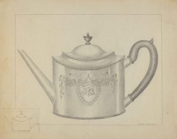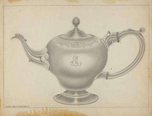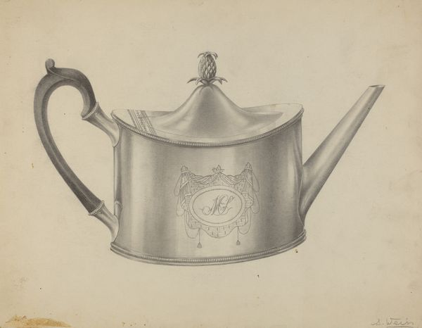 Editor: So here we have Horace Reina's "Silver Teapot," created around 1937. It's a drawing done in pencil, and it's so precise it almost looks like a photograph! I'm really drawn to the details and ornamentation. What do you see in this piece? Curator: Well, focusing on materiality, this isn't just a representation of a teapot. Reina painstakingly renders silver—a material with very specific economic and social connotations in the 1930s. Consider the labor involved in crafting a silver teapot, and then the labor involved in meticulously drawing it. The artist is almost participating in an act of… duplication, or perhaps appreciation? What’s being said about production? Editor: That’s interesting… I hadn’t thought about it in terms of labor. I was mostly just appreciating the pretty details and the sort of old-world luxury it implies. Curator: Exactly! Luxury isn’t inherent. It’s constructed through material and labor. The geometric elements, almost hidden beneath the ornamentation, remind us that underneath the decorative surface lies a calculated design. How might that tension reflect societal values of the time? Editor: So, you're saying it’s less about the teapot itself, and more about what it represents in terms of production, consumption and values associated with silver and fine craftsmanship in that era? Curator: Precisely. It prompts us to question the role of objects in reflecting and shaping our societal values and hierarchies. It transcends just being 'pretty.' The piece becomes an examination of class, labor and materiality through close observation and depiction. Editor: That's really shifted my perspective. I was seeing it as just a nice drawing of a teapot, but it's so much more layered. Thanks for pointing out the social and economic considerations embedded in it. Curator: My pleasure. It’s always rewarding to look beyond the surface and consider the broader implications of an artwork's materials and making.
