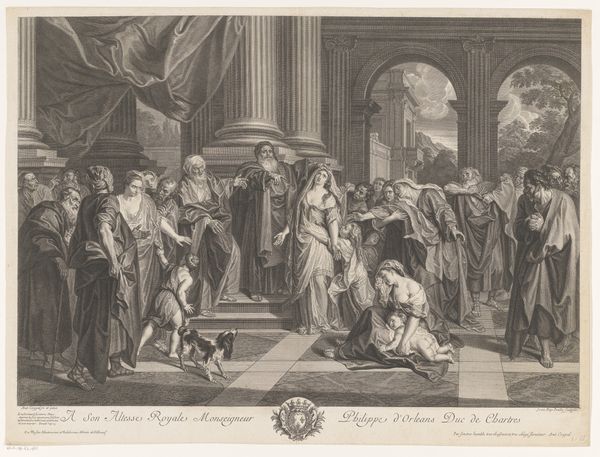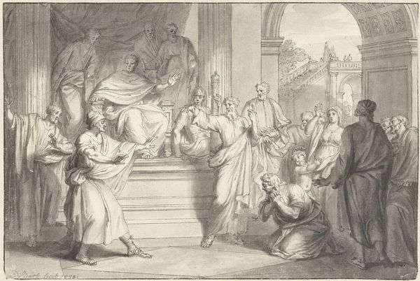 Louis Léopold Boilly rendered "The Arcades at the Palais-Royal" using brush and black ink with gray wash on paper. This drawing provides a glimpse into the bustling social life of late 18th-century Paris, capturing the Palais-Royal, a hub of commerce, leisure, and intrigue. In this transitional moment in France the Palais-Royal was a melting pot where class distinctions blurred amidst the arcades. Boilly's representation of women is particularly striking; they are shown as active participants in public life. The scene hints at the complexities of gender and class within this space, capturing both the freedoms and the constraints experienced by women. Observe the dogs in the foreground, a symbol of wealth and status, and the presence of children, underscoring themes of inheritance and social mobility. As you take in the broader tableau of social interactions, consider how Boilly invites us to reflect on the performance of identity, and the ever-shifting dynamics of Parisian society.