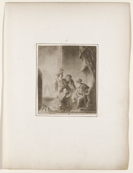 Emile Boilvin created this print titled 'Dame onder parasol met fluitspeler' using etching. Notice how the composition is framed within an oval, creating a contained world. The monochromatic palette emphasizes tonal contrasts, where light dances across the figures and foliage. The parasol serves as a focal point, its circular form echoing the overall frame. The etching technique allows for fine lines and detailed textures, bringing a tactile quality to the scene. The artist's meticulous approach is evident in the intricate rendering of fabric and foliage, which invites us to explore the textures within the image. These elements evoke a sense of refinement and leisurely elegance. The image is not just a picture but rather a structural system where each element contributes to the whole. The soft light and delicate lines encourage us to consider how the work engages with ideas of representation and perception.