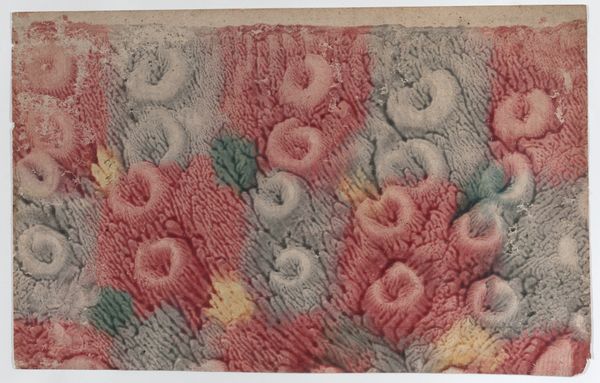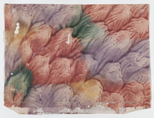 Editor: Here we have an anonymous paste paper drawing, dating from somewhere between 1700 and 1800. It's watercolor on paper, with an abstract design in reds, purples, yellows, and greens. I find the overall effect quite soothing, almost like looking at a watercolor cloudscape. What do you make of it? Curator: The charm of this work, from a formalist perspective, resides primarily in the interplay of its visual components. Note the textures created by the paste paper technique. It disrupts the smooth surface we might expect from watercolor, adding a tactile dimension. The composition favors a dispersed, all-over pattern, rejecting a clear focal point, wouldn't you agree? Editor: I do. It’s quite decentralized, but are we sure it’s intentional, given the damage to the edges? Curator: Perhaps. However, observe the relationships between the colors. The artist utilizes a limited palette, relying on subtle gradations and the bleeding of pigments into one another to generate visual interest. The dominance of red and purple, with strategically placed yellows and greens, forms a visually coherent scheme. Does that balance of saturation affect your interpretation? Editor: It does. The greens and yellows pop a bit more than I initially noticed, offering little focal points throughout. So, focusing just on the art itself, without historical context, reveals new depths in its composition. Thanks! Curator: Indeed. Through close visual analysis, we can discern an aesthetic intention rooted in material and compositional relationships. My pleasure.