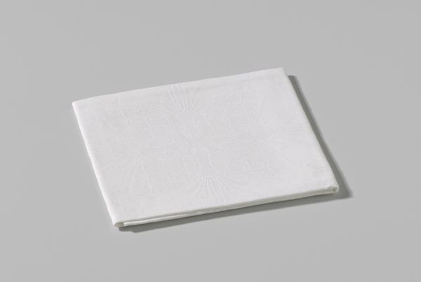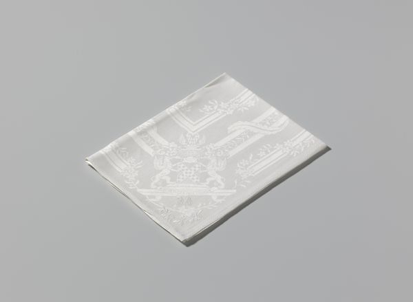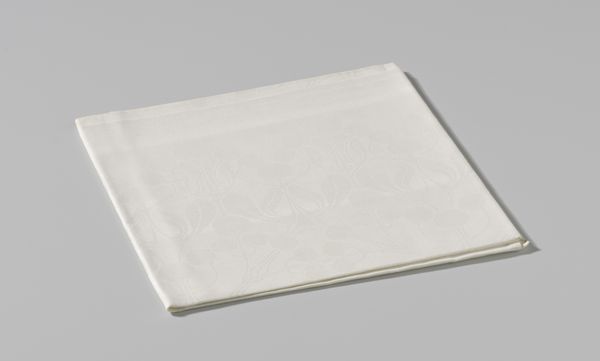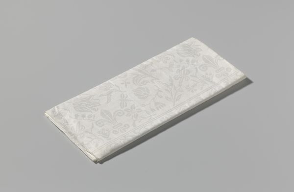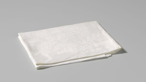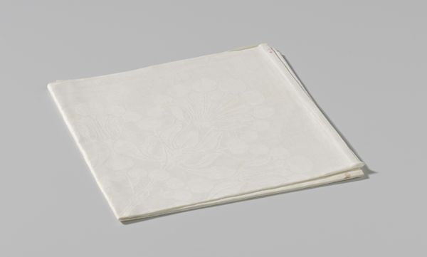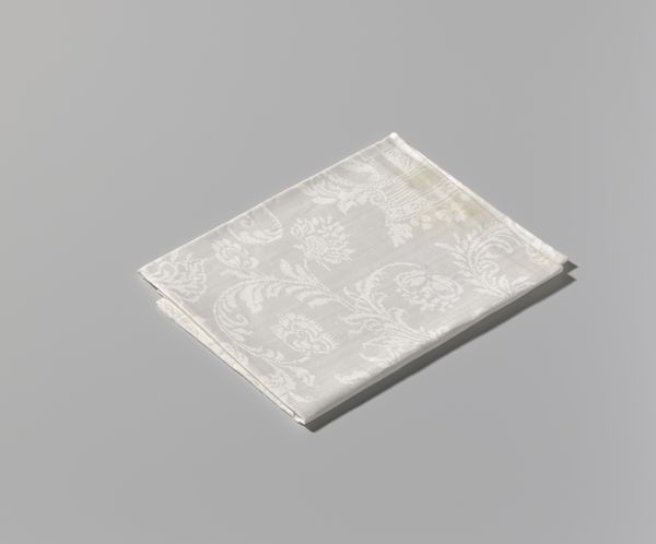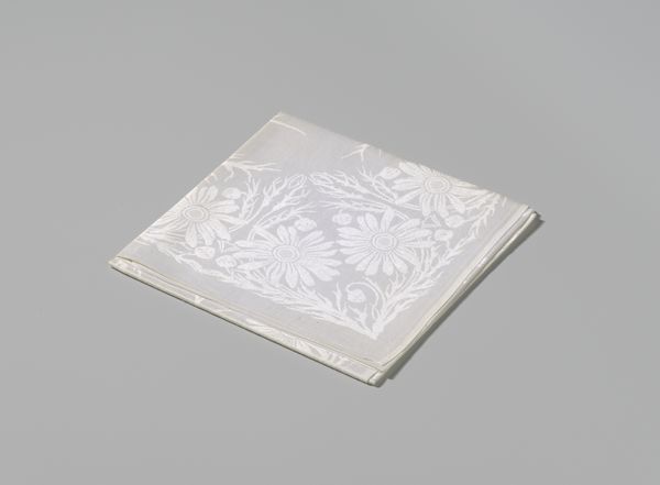 This is a linen damask napkin with a Marguerite design, crafted by Cornelis van der Sluys. The square form is softened by the intricate floral pattern. The tactile quality of the linen invites a sensory engagement beyond mere visual appreciation. The design features daisies and foliage woven in a subtle interplay of raised and lowered surfaces. This detailed patterning suggests an engagement with the principles of structuralism. The napkin, typically a mundane object, is elevated through its design. It transcends its utilitarian purpose to become a site of aesthetic contemplation. The monochromatic palette, while understated, serves to emphasize the texture and the dimensionality of the weave. This napkin challenges our assumptions about value and artistry in everyday objects. The careful arrangement of botanical motifs reflects a semiotic encoding, where nature is not merely depicted but also symbolically represented. It invites us to question how meaning is constructed through both design and utility.