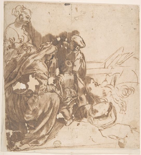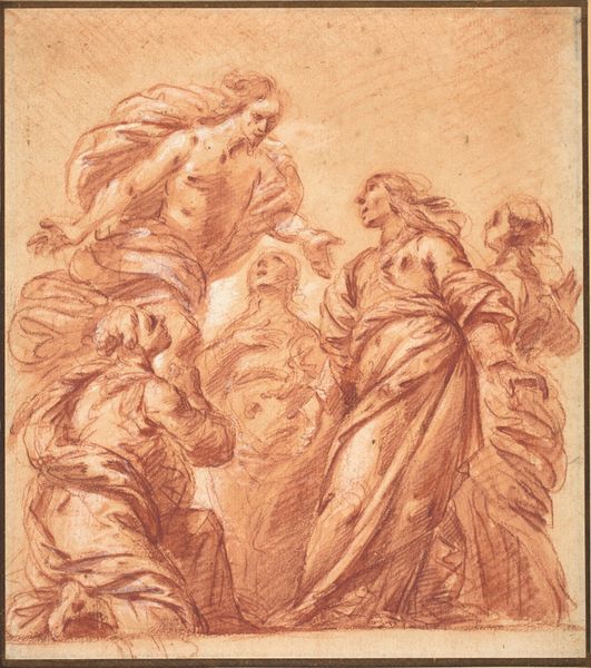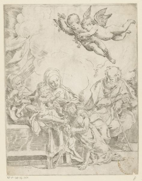 Curator: Immediately striking, isn't it? There's an almost theatrical grandeur to it. Editor: Indeed. This is an ink drawing dating from the Baroque period, sometime between 1600 and 1700. While its creator is currently listed as Anonymous, it depicts "God the Father Seated on a Cloud, Flanked by Two Putti." You can view it here at the Metropolitan Museum of Art. Curator: I find the composition particularly interesting. God the Father is centrally positioned, dominating the visual space, but the two putti disrupt what could be a rigid hierarchy. Their presence humanizes the divine. It speaks to Baroque fascination with mixing the earthly and the spiritual. Editor: Absolutely. Consider the role of such imagery within the Church and society of the time. Representations like these solidified power structures, portraying God as a benevolent, yet unquestionably supreme, paternal figure. These images are propaganda just as much as they are spiritual art. Curator: Propaganda might be too strong of a word. I would argue that it offered, even reinforced, an aspirational idea. Looking at it today, however, I can’t help but consider its implications for societal structures—patriarchal, yes, but also what the cherubs’ whiteness can imply. It is exclusionary, a single perspective promoted over many, even here within a supposed ideal of divinity. Editor: The institutional forces at play here—the patrons who commissioned this, the audiences who were meant to consume its message. It's all interwoven. Curator: Exactly. While technically superb, such figuration necessitates deeper engagement. It's important to situate its narratives of divinity within power dynamics and historical narratives. Editor: Indeed, approaching works such as these require acknowledging the complex negotiations of art history. Considering context and purpose ensures balanced assessment. Curator: This piece offers a profound insight. How historical context and faith affect us and our idea of representation, both past and present. Editor: Precisely. It encourages dialogue with historical works but situates that within broader and ever more relevant cultural terms.