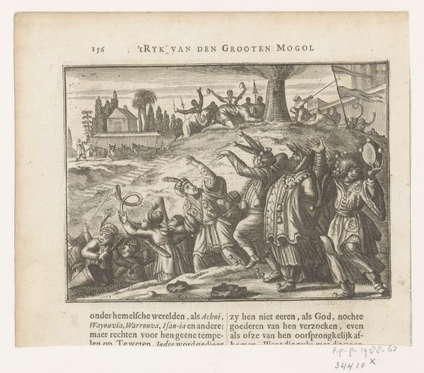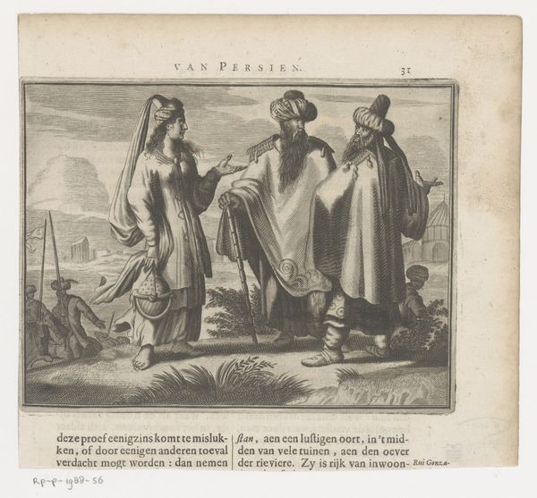 Editor: This engraving, made in 1672, is titled "Malik Ambar, regent van de Nizamshahi dynasty" and its artist is anonymous. The way it's printed gives the scene a crisp, almost storybook feel. What's your take on this work? Curator: For me, it is fundamentally about the colonial gaze shaping the means of production. This print wasn’t created in a vacuum. It speaks volumes about the consumption of the 'Orient' for a European audience. Think about the labour involved in both the depicted scene and the printing process. Editor: I see what you mean about labor. I hadn't considered the contrast between the portrayal of enslaved people in the scene and the engraver's own work. But how does that shape our understanding? Curator: It shifts the focus to the circulation of these images. This print becomes a commodity itself, contributing to a specific, marketable understanding of power dynamics between Europe and India. Look at the clothing, the textures that the engraver painstakingly created with what material? A metal plate. Why? Editor: Ah, the metal! It's about control and the dissemination of images... Almost a standardization. So it becomes less about Malik Ambar as a historical figure and more about... European influence. Curator: Precisely! We're not just looking at a portrait, but at the materials, the methods, and the market that made this portrayal possible, shaping perceptions and power. Editor: That's a powerful reframing. I’ll never look at an old print the same way again. Curator: Exactly. Always look at art through the lens of materials, labour, and systems of power. That gives it new life and fresh insights.