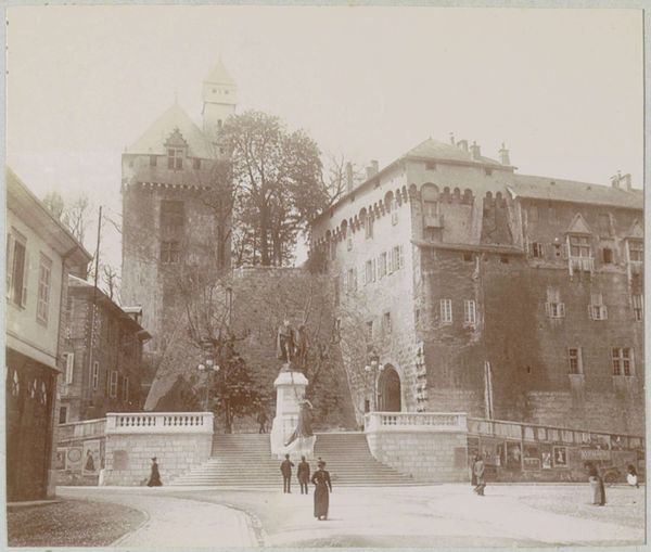Editor: Here we have Francis Bedford's "View of Raglan Castle, Monmouthshire," taken before 1862, a gelatin-silver print. I'm struck by how this photographic print makes the castle's ruins appear grand yet somehow softened by time. What historical context do you see informing this image? Curator: Bedford's photography gains significance when viewed through the lens of 19th-century British Romanticism and the rise of heritage tourism. The castle is not merely presented as ruins but as a picturesque landscape. The presence of figures subtly hints at how the gentry are engaging with these sites, almost as curated historical experiences. It emphasizes the political undertones of nostalgia. Do you think the inclusion of people impacts our reception? Editor: Definitely, the figures transform the ruin from a mere architectural relic into a place where people connect with history. It seems Bedford captured more than just the landscape; he depicted the beginning of modern heritage tourism. But were the ruins already a popular destination? Curator: Yes, the popularization of picturesque landscape painting helped to cultivate a taste for ruins. Railway expansion also granted access. Bedford's work solidified Raglan Castle within this cultural appetite and promoted the ideal. Also note, his art directly informed social ideas around history and national identity. Editor: So, it’s not just a ruin but a stage for constructing national identity. Photography was fairly new, but do you think its novelty contributed to its popularity? Curator: Exactly. Photography's claim to objective representation lent authority, subtly influencing social perceptions of the past. Its newness would offer a scientific lens, that would then influence popular consumption. In summary, what aspects resonate most with you? Editor: Understanding the photo's link to burgeoning tourism and how it actively shaped, not just recorded, British history provides a new layer of understanding for me. I initially only saw ruins but missed the narrative of heritage tourism at play. Curator: Absolutely, considering how the past is packaged and presented enhances how we appreciate its influence on culture and public memory.
