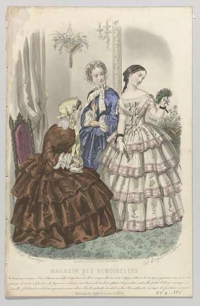 This is a print by J. Desjardins titled Magasin des Demoiselles, created in Paris in September 1853. Observe the rose held by the central figure, a symbol of beauty and love, reaching far back to antiquity where Aphrodite, the goddess of love, was often depicted adorned with roses. Yet here, its presence is more complex, embodying a certain ambivalence. The rose, traditionally a symbol of love, is presented almost as a mere accessory, a fashionable emblem within the confines of the demure young lady and luxurious surroundings. The motif of the flower, and the rose in particular, is seen across different eras and cultures, from Botticelli's ethereal Venus to the Pre-Raphaelites' depictions of tragic heroines, each time subtly shifting its meaning. Perhaps, subconsciously, its cyclical reappearance mirrors our ever-evolving understanding of beauty and desire, constantly renegotiated through the lens of time and culture.