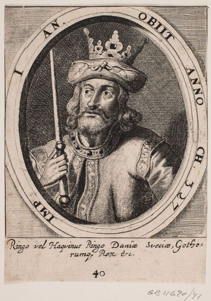 This engraving, "Kong Jarmerik," by an anonymous artist, presents a study in contrasts through its intricate linework. The tight, almost frenetic hatching defines the figure within an oval frame, immediately drawing the eye to the king’s face. Notice the use of line to delineate texture and form: the coarse beard, the heavy chain, and the regal crown are rendered with a precision that speaks to the engraver's skill. The composition, contained within the oval, isolates the king, enhancing the sense of his authority and presence. The text encircling the portrait acts as a semiotic anchor, grounding the image in a specific historical and cultural context. Yet, the very act of framing and naming invites us to question the nature of representation and power. How does this constructed image of kingship challenge or reinforce established notions of authority? It's a fascinating interplay between image, text, and historical narrative.