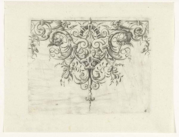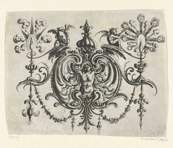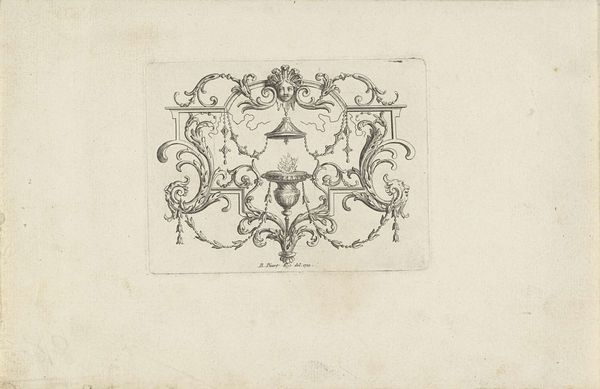 This is an ornamental design with a winged female torso by H. Picart. During the time this print was made, ornament prints were used as models by artisans who were not always allowed the creative freedom to express themselves. The winged female figure gives a nod to classical mythology, but within the strict confines of decorative art. The ornament is rife with swirls and botanicals, and evokes an ethereal sensibility, though it feels more like a suggestion of freedom rather than a full expression of it. In this sense, the female figure becomes a symbol of what is suppressed, but not completely extinguished. The tension between freedom and constraint asks us to consider the role of women in society at the time, and the ways in which their identities were both celebrated and confined. The design prompts a conversation about the tensions between the status quo and the desire for change.