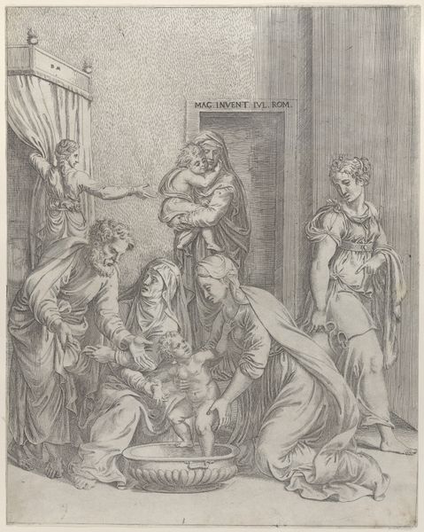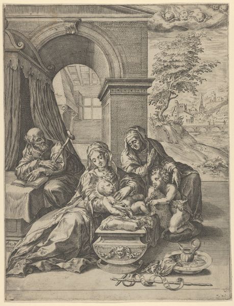 Giovanni Battista Fontana created this small engraving, The Birth of the Virgin, sometime in the second half of the 16th century. The scene depicts the traditional story of the Virgin Mary's birth to her parents, Anne and Joachim, attended by midwives. Produced in Italy during the Counter-Reformation, this print reflects the period's renewed emphasis on religious orthodoxy and the promotion of key Catholic figures, particularly the Virgin Mary. This was a period when the Church authorities sought to harness the power of images to reinforce religious doctrine and inspire piety among the faithful. The print participates in this project by presenting the birth of the Virgin as a miraculous event, emphasizing her purity and divine nature. To understand the image better, one might consult theological treatises and Church records from the period to understand the social and institutional context that gave rise to its creation. Only then can we fully appreciate the ways in which Fontana's print reflects and reinforces the religious and social norms of its time.