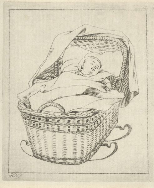 Hermanus Numan created this print of a sleeping baby in a cradle sometime in the late 18th century. During this period, the Dutch Republic was undergoing significant social and political change, with growing class divisions. Numan, who positioned himself within the cultural elite, presents us with a serene image of domesticity. The baby, likely white and from a well-to-do family, is peacefully asleep in a woven basket. The basket itself speaks to labor and craft, yet the scene omits the hands that would have woven it, or the arms that would have rocked the cradle. Consider the absence of the mother, or the wet nurse, figures often central to childcare at this time. Instead, we are left with an idealized, perhaps sentimental view of infancy, one that reinforces the era’s social hierarchies by what it chooses to show, and equally, by what it leaves unseen. The print offers a glimpse into the private sphere, carefully constructed to convey innocence and tranquility, yet hinting at the societal structures that uphold it.