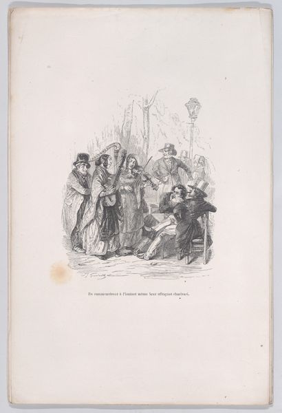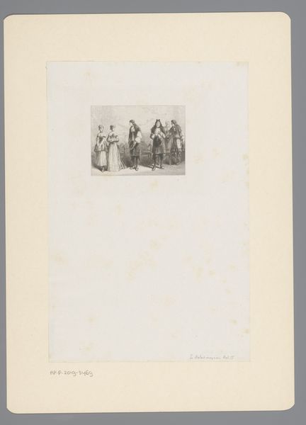 Editor: This is "Boer vraagt om rechtspraak aan Willem de Goede," or "Peasant seeking Justice from William the Good," an engraving made in 1842 by Herman Frederik Carel ten Kate. The scene feels very staged to me, and dramatic. What stands out to you in this piece? Curator: Immediately, I’m struck by the power dynamics presented, and how this image functions as a historical narrative. We see a figure kneeling before William, seemingly pleading for justice. But who gets to decide what is “good” justice? Editor: That’s a really good question! Curator: The image needs to be situated within its historical context. How does it reflect ideas about power, governance, and the relationship between the ruler and the ruled? Consider the attire: the "boer," or farmer, is less ornamented. It speaks to the very different power held between the two. Editor: So, beyond just illustrating a historical moment, it's making a statement about social and economic divisions, right? It’s almost propaganda. Curator: Precisely! How do we read it critically, understanding the biases and ideologies potentially embedded within its romanticized portrayal of this event? Think about the social implications of the way each person is presented. Who is being humanized, and who is being othered? Editor: I never would have thought to go so deep! Thanks, that gives me a lot to think about in terms of historical context and social meaning. Curator: Absolutely, art becomes truly fascinating when viewed through the lens of intersectional historical and theoretical frames!