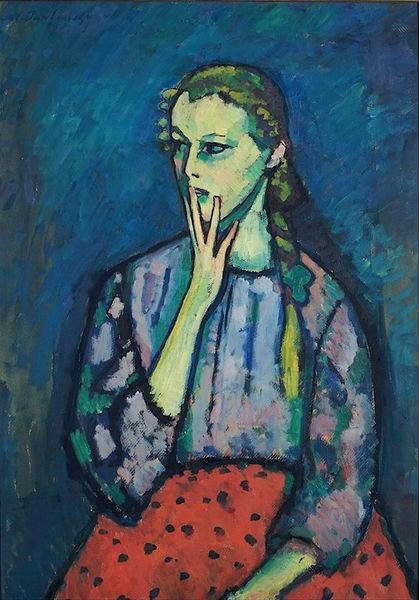 Editor: Jawlensky's "Nude," painted in 1912 with oils, is arresting. The brushstrokes are so bold and the colors surprisingly vivid. I'm particularly struck by how he uses color to define form. What can you tell me about this piece? Curator: It’s interesting to consider this “Nude” within the historical context of early 20th-century anxieties around sexuality and representation. The Fauvist and Expressionist movements, to which Jawlensky aligned himself, were pushing against academic traditions, and challenging bourgeois notions of beauty and decorum. Notice how the seemingly distorted form and heightened color disrupt conventional representations of the female nude. How do you think the public might have reacted to such a portrayal at the time? Editor: I imagine it would have been considered quite radical! The colors alone scream rebellion. Was Jawlensky intentionally trying to provoke a reaction? Curator: Possibly. Artists like Jawlensky were engaging with a broader shift in visual culture. They aimed to move beyond mere imitation and express inner states. They also explored primitivism. There’s a dialogue happening here with other art forms, including non-Western art, impacting the politics of the imagery. Museums played a role by either embracing or rejecting these avant-garde expressions. Editor: So, the shock value wasn't just about the nude itself, but the way it was painted and the challenge it posed to artistic conventions. That’s a whole new perspective. Curator: Exactly. This "Nude" is less about an idealized form and more about the artist's subjective experience and the changing role of art within society. Editor: I never thought about museums shaping the reception, that’s brilliant. I’ll definitely keep that in mind next time I look at art from this period. Thanks!