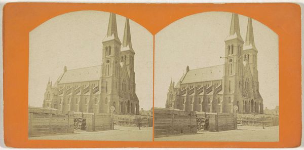 Editor: This photograph is "Dom van Halberstadt" by Hermann Selle, dating from between 1868 and 1890. It looks like a print from a photographic negative. There's something almost dreamlike about the soft focus and the symmetry. What do you see when you look at it? Curator: Primarily, I'm drawn to the interplay of light and shadow and how it defines the architectural form. The composition directs the gaze upward, emphasizing the spires. Consider the use of line – the strong verticality of the towers against the horizontal plane established by the trees. Does that contrast inform your impression? Editor: I see what you mean. The upward lines of the spires definitely create a sense of grandeur. Is the somewhat obscured facade an intentional artistic choice, obscuring a clearer reading? Curator: Perhaps. We might also consider the tonality. The limited tonal range contributes to a flattened perspective, de-emphasizing depth in favor of surface texture and patterns created by light. How do these formal aspects shape your experience of the work? Editor: It feels almost… static, I suppose. Like a monument captured in a fleeting moment. Curator: Precisely! That tension between permanence and transience is interesting here. Through composition and tonal range, the photograph freezes a moment in time, underscoring architectural solidity against the ephemerality of light and shadow. Editor: It's interesting how focusing on the composition changes how I see the picture. Thanks for helping me consider that! Curator: My pleasure. Close visual analysis reveals nuances often overlooked at first glance, which shows how meaning emerges from form.