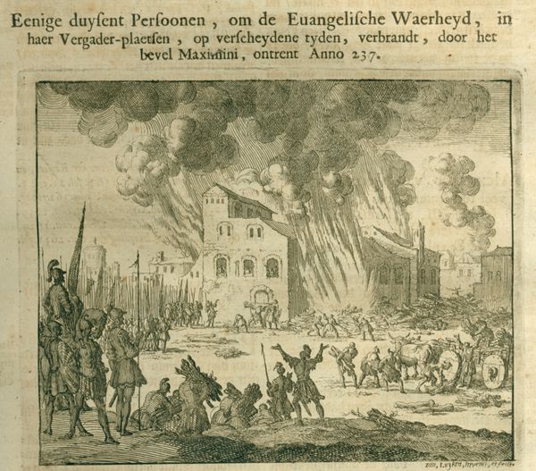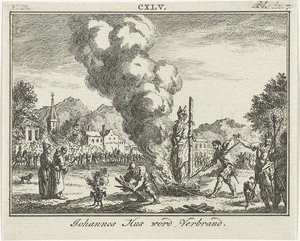 Simon Fokke created this etching titled "Destruction of the Castle of Gijsbrecht II van Amstel, 1204" sometime in the 18th century. It captures a dramatic moment from Dutch history, steeped in power struggles and territorial disputes. Fokke, working during the Enlightenment, was part of a society grappling with ideas of nationhood. Here, he depicts the siege of Gijsbrecht van Amstel's castle, an event that marked a shift in regional dominance. Van Amstel, a controversial figure, was seen by some as a symbol of resistance against the Count of Holland, while others viewed him as a rebellious lord. What you see here is not just a castle ablaze, but the clash of identities and allegiances. The etching emphasizes the raw power and violence of the siege, but think about how Fokke, as an artist, might have felt portraying such a destructive moment. He was tasked with illustrating the foundations of Dutch identity. The etching asks us to consider who gets to write history, and whose stories are told.
