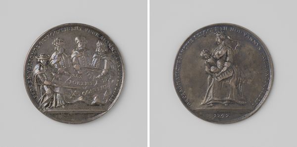 Curator: "60.000 Germans Driven Across the Rhine by the French," a bronze relief by Jean Mauger, crafted between 1699 and 1703. It's a striking piece, almost feels like a coin of some kind, commemorating a moment in history. How would you interpret the visual impact of its form and texture? Editor: It definitely feels like a coin. I am interested to hear how we can examine its process, materials, and social context in order to understand it. How do we dive deeper into the piece and understand the materiality and the act of consumption. Curator: Well, considering the material - bronze - and its replication as a coin, think about how that changes its function. It moves beyond a singular art object to something potentially mass-produced, intended for circulation. It's a tangible object commemorating power. So, the question is: how does the inherent value of the metal itself become intertwined with the value of the political message? Who would have been handling these objects? What type of metal were they manufactured from? Editor: So, it is like propaganda in a physical form, using valuable materials to enhance its importance? Did the material act as a display of value for its commissioner? Curator: Precisely! And this isn't just about showcasing royal might; it’s also about the labor involved – the mining, the smelting, the engraving, the striking of the coin itself. Each stage tells a story about the economy and society of the time. How do you think these layers of material and labor impact its message? Editor: I think that is incredibly powerful. The layering of value enhances the coin with many elements adding weight to its cultural and monetary status. You are showing me the layers upon layers that exist to convey the intended message. Thank you for this perspective! Curator: My pleasure. Always remember to ask about who made it, how, and why that medium was chosen to see past what is shown to be an idealized symbol, so as to interpret the artwork from a new and enriched point of view.