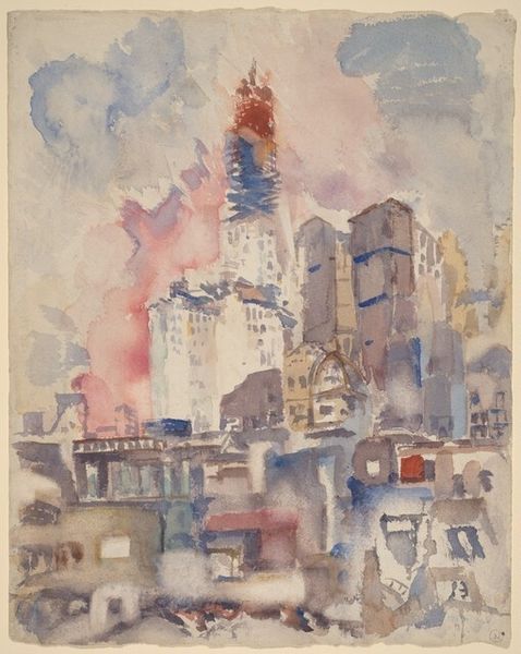 Curator: Here we have John Marin's "View of New York," dating back to around 1913, rendered in watercolor. Editor: It’s ephemeral, like a memory fading. The watery washes almost dissolve the buildings, giving it an atmospheric haziness. You feel the weight of the city as a ghostly presence. Curator: Indeed. Marin's modernist approach saw him capture New York as a pulsating, dynamic entity. These architectural forms are certainly representational, but they’re also imbued with a sense of the city's frenetic energy through expressive lines and blocks of color. Look at how he creates these towers out of strokes of blue and grey. What do you think about the implications of these blurred and distorted city views in the cultural and psychological consciousness of the time? Editor: The blurring speaks volumes, I think, about industrial process, how it felt to experience urbanization and modernity in those early years of the twentieth century. The quick, loose application of watercolor shows the hand of the artist very deliberately. And using watercolor itself feels like a statement about rejecting the heavy traditions of oil painting, choosing instead a medium that dries quickly and reflects light and that evokes the changeable modern city. Curator: The medium adds another layer. Watercolor is so tied to landscape and light. Marin transposes those associations to the cityscape. And those delicate hues contrast beautifully with the stark verticals that characterize New York's architecture. Do you read any symbolic meaning in his palette choice? Editor: Blue is of course associated with industrial work in the factories while rose might signal the dreams for social revolution during the modernist turn-of-the-century, it is of course difficult to state definitively, but looking at the image itself, I see evidence that such aspirations existed. There seems to be more going on beyond simple depiction. I love the way the medium feels intrinsic to what he’s trying to express. Curator: A fresh perspective connecting material, message and symbolic aspiration; I agree completely! Thanks so much for joining me! Editor: My pleasure! The image reveals new information the longer one looks!