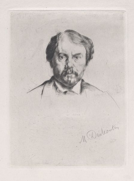 Marcellin Desboutin’s portrait of Jules Sandeau is an etching, a printmaking technique that renders fine, detailed lines with remarkable precision. The print presents us with a study in contrasts: Sandeau’s face, rendered with meticulous detail, emerges from a background of subtle gradations. Notice how Desboutin uses hatching to sculpt Sandeau’s features, creating a play of light and shadow that gives the portrait depth. The close attention to line and tone may reflect a semiotic attempt to capture not just likeness, but a deeper understanding of Sandeau’s character. The artist uses visual signs, such as the sitter's balding head and prominent mustache, to convey a sense of bourgeois masculinity. The etched line becomes a tool of signification, encoding the social identity of the sitter. Consider how the print challenges the established conventions of portraiture. This approach to capturing Sandeau destabilizes traditional notions of representation. The formal qualities of the etching, in their precision and restraint, offer a glimpse into the complex interplay between artistic technique and social meaning.
