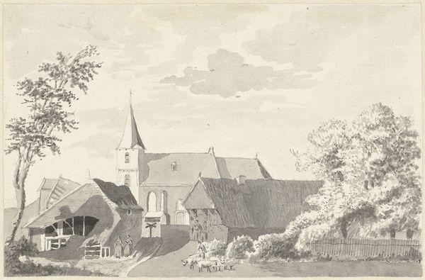 Curator: We’re looking at an 18th-century ink and paper drawing entitled "Dorpskerk van Weurt," attributed to W.M. Obreen. The scene captures a village church amidst a sparse landscape. Editor: The somber gray ink gives the drawing a quiet, almost melancholy feel. The weight of time feels palpable, both in the style and the subject. Curator: Absolutely. Churches often act as enduring symbols of community and faith. Here, the steeple pierces the sky, a clear signifier. Its presence probably offers more than a mere structural point of reference. Editor: While I appreciate the spiritual connotations, I am intrigued by the actual materiality of this village. I'm considering how a humble construction like this reflects available materials and the labor required. The building has a rough simplicity, clearly dictated by what was on hand, reflecting very directly how a whole social organism might subsist. Curator: Note that it also adheres, loosely, to baroque conventions. The perspective leads the eye towards the church; yet it is simple compared to the era’s extravagant flourishes often associated with ecclesiastic display. Do you think this is due to more regional, humbler tastes? Editor: That’s precisely it. Forget gilded excess, you have paper, ink and modest architecture. I can imagine that Obreen would need to gather these raw materials himself, or commission paper and ink making, adding layers of practical artistry and local support. The artist perhaps intimately connected with local trade? Curator: Possibly, and how intriguing that these common folk are congregating around the space; one could venture interpretations ranging from actual prayer or local socializing. A subtle depiction of social roles? Editor: More likely, these sorts of gatherings reflect village economy, and the slow accumulation of interactions defining this isolated world. Curator: Very different approaches. The work prompts reflections on faith, but also, crucially, reminds us of how much of art, then and now, roots itself firmly in material realities. Editor: Yes. Even depictions of the ethereal reveal earthly truths!