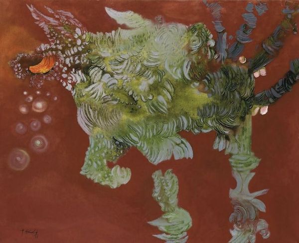Russ Warren’s mixed media artwork, "Night Fishing At Moms", presents us with a playful yet unsettling composition, a formal structure in three panels. The panels blend sea creatures rendered in bold colors, which are contained by geometric shapes and lines. The flat space and repeated motifs create a visual rhythm, where elements like spirals and sharks compete for our attention. The work destabilizes conventional representation of marine life. Warren uses a semiotic system of signs: sharks aren’t menacing but almost cartoonish, the fishing rods are awkwardly angled, which challenges fixed notions of how we perceive the natural world. The artist engages with contemporary ideas about the environment, filtered through a lens of pop culture. The artist plays with form and meaning and prompts us to re-evaluate our relationship with the ocean. The seemingly simple, decorative elements invite deeper reflection on our cultural values.